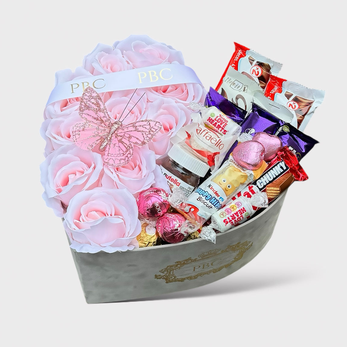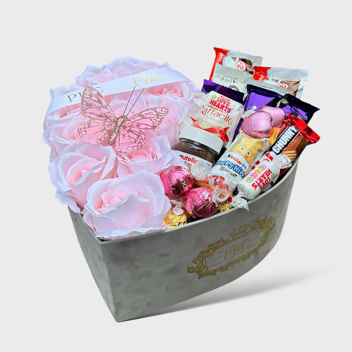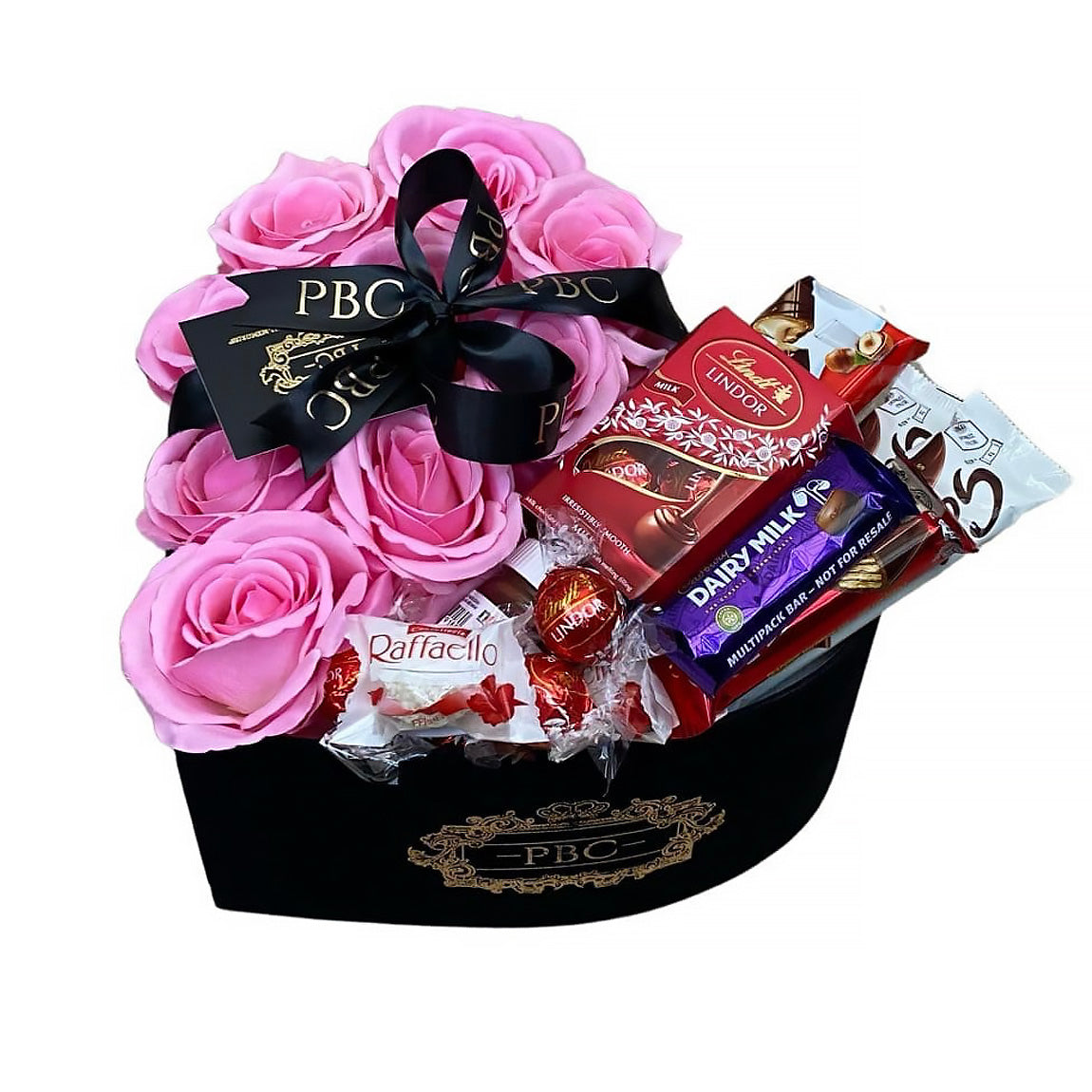 Box Content: Artificial Flower Heads, 2x Ferrero Rocher, 1x Kinder Bueno, 1x Galaxy (Smooth Milk), 1x Galaxy Caramel, 1x KitKat Chunky, 1x Nutella (Mini), 1x Lindor Box (Mini 50g), 2x Raffaelo, 1x Butterfly, Ribbon Included