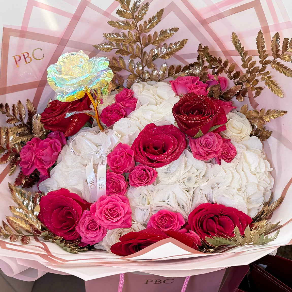 Bouquet Colours: White, Cream, Hot Pink, Red, with optional Gold Foliage